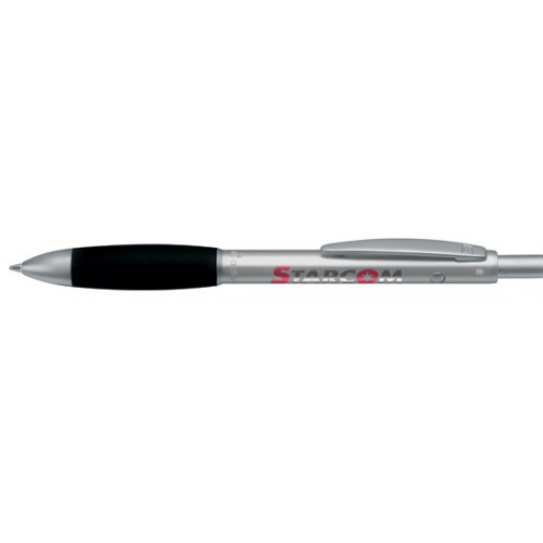 Многофункциональный пишущий прибор с серебряным алюминиевым корпусом и черной мягкой зоной грифа. Шариковый стержень с черной пастой и полимерным стержнем 0,7 мм. Ластик под кнопкой.