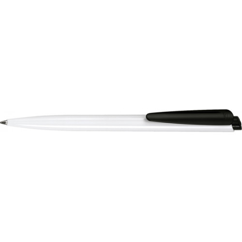 Шариковая авторучка, броский нажимной механизм, широкий клип. Качественный стержень с синей или чёрной пастой.