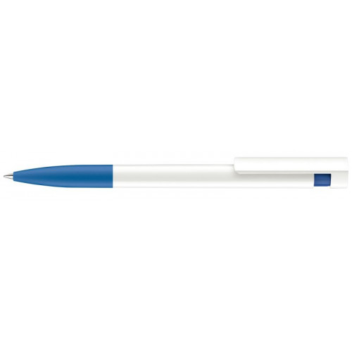 Шариковая ручка с нажимным механизмом. Полированная поверхность корпуса, белый корпус, цветная мягкая зона грифа под цвет верхней части, Стержень magic flow c синей или черной пастой. Толщина штриха 1.0 мм.