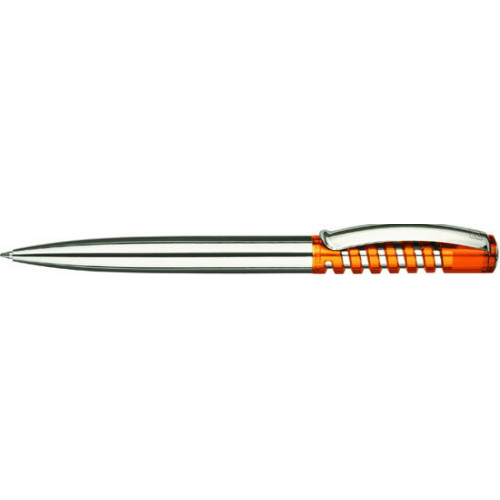 Шариковая авторучка с оригинальной механикой нажимного колпачка. Верхняя часть ручки из блестящего прозрачного пластика. Массивный металлический корпус и широкий металлический клип. Металлизированная внутренняя деталь под спиралью и кнопка на колпачк